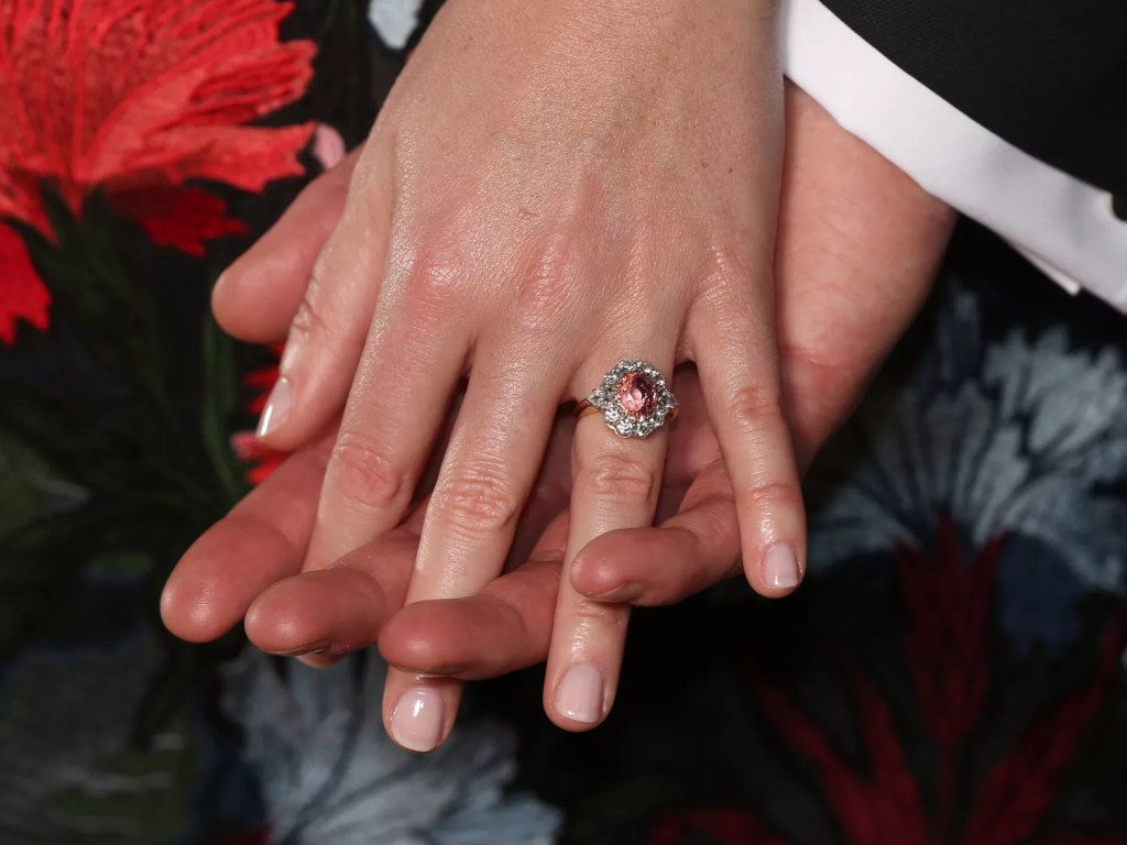 I personally love Eugenie’s ring. It features a central Padparadscha sapphire surrounded by diamonds, and looks quite similar to the Sarah Ferguson, the Duchess of York aka Fergie’s ring. Sentimental, but still her own.