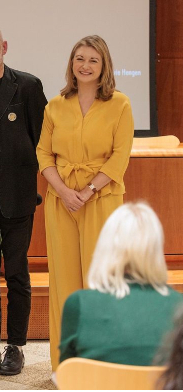 On December 7th, Hereditary Grand Duchess Stéphanie of Luxembourg presented an award to Joey Adam, an artist from Luxembourg for his work making costumes. She wore a full MaxMara outfit in a bright, sunshine-y yellow.
