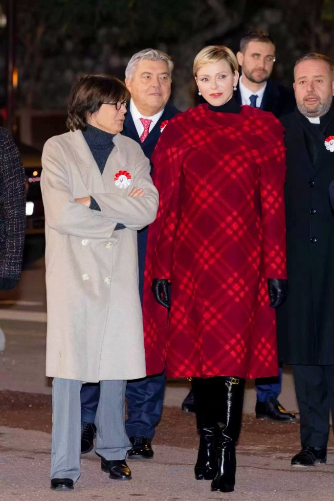Princess Charlene wore a very festive Burberry coat for the occasion.