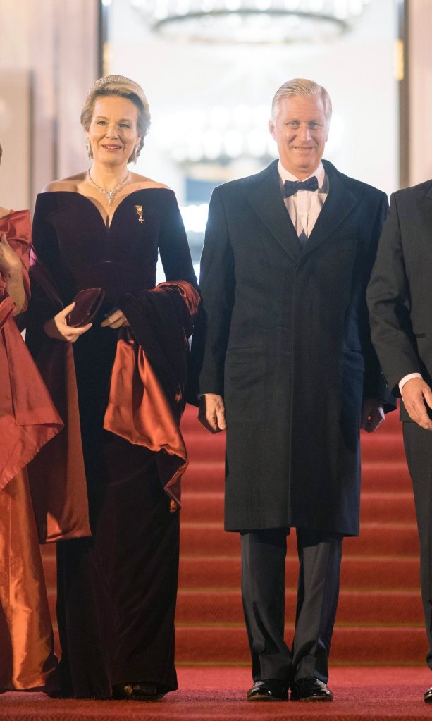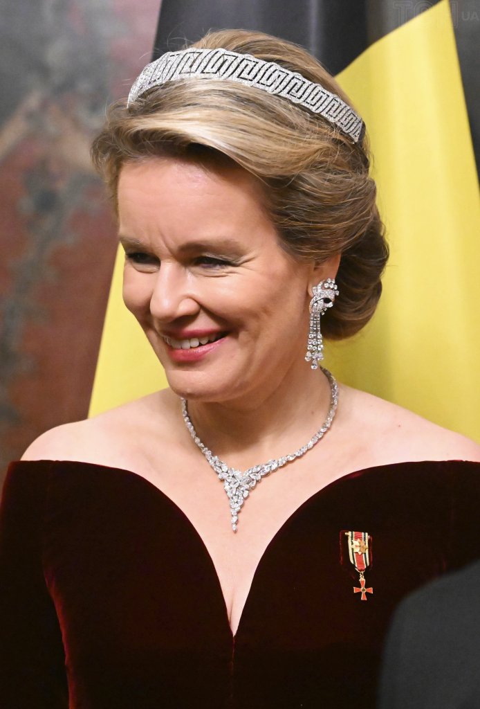 The King and Queen of the Belgians undertook a state visit to Germany this past week. On December 5th, they attended a state banquet in Berlin, with Queen Mathilde wearing an Armani Privé gown. She also wore a diamond necklace and the base of the Nine Provinces tiara. Here’s a nice close up: