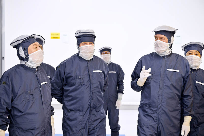 Later in the day, the King and the President attended a roundtable (literally), with Dutch and Korean CEO’s from the semiconductor business sector. This took place at ASML which is an organization that provides the technology for producing semiconductors. They got a look at the cleanroom where this tech is created: