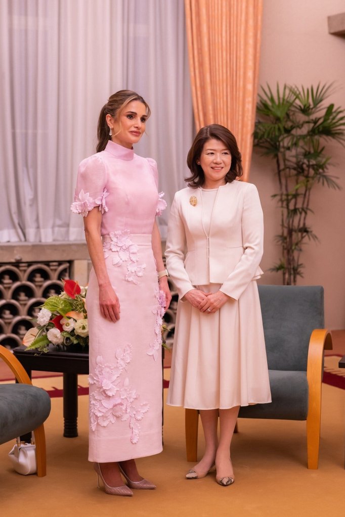 Oh wow what a surprise, another pink floral outfit makes the list. Queen Rania wore a matching Zimmerman top and skirt with floral appliqués in April to meet with Yuko Kishida, who is married to the Prime Minister of Japan. The whole look is wonderful in my opinion, especially with the ponytail tendrils.