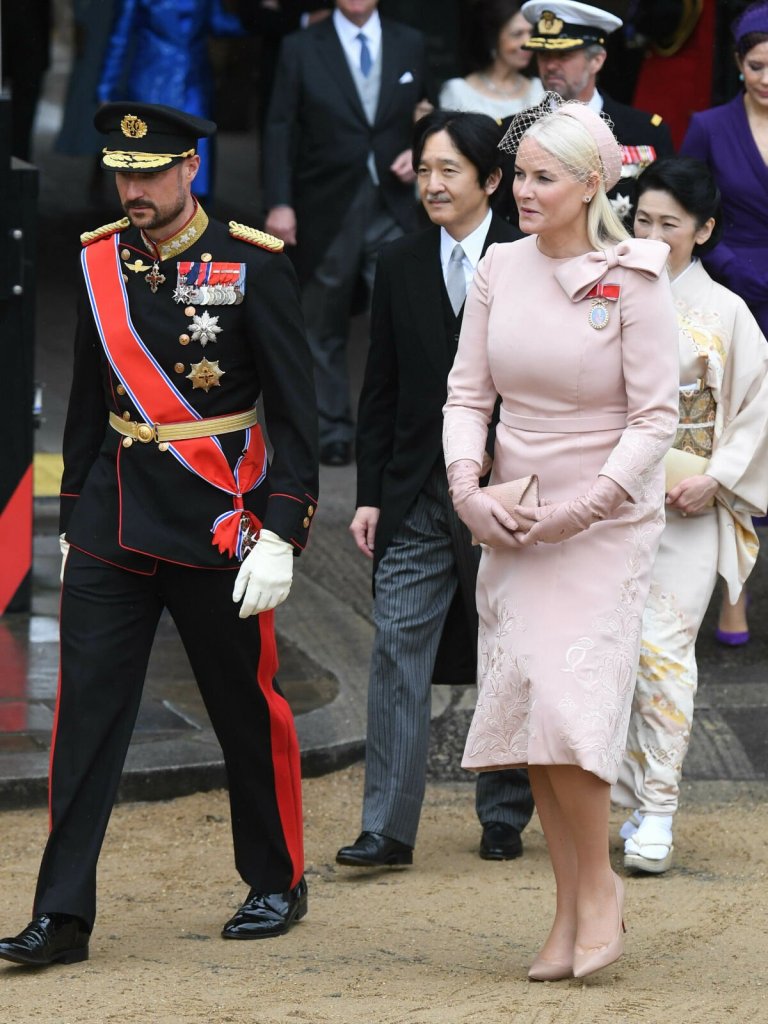 Crown Prince Haakon and Crown Princess Mette-Marit were among the guests at the coronation for King Charles III and Queen Camilla this year. Mette-Marit wore pretty pink dress with embroidery along the sides and wrists. The matching gloves, pillbox hat, and the sweet bow on her shoulder really brought the whole look together.